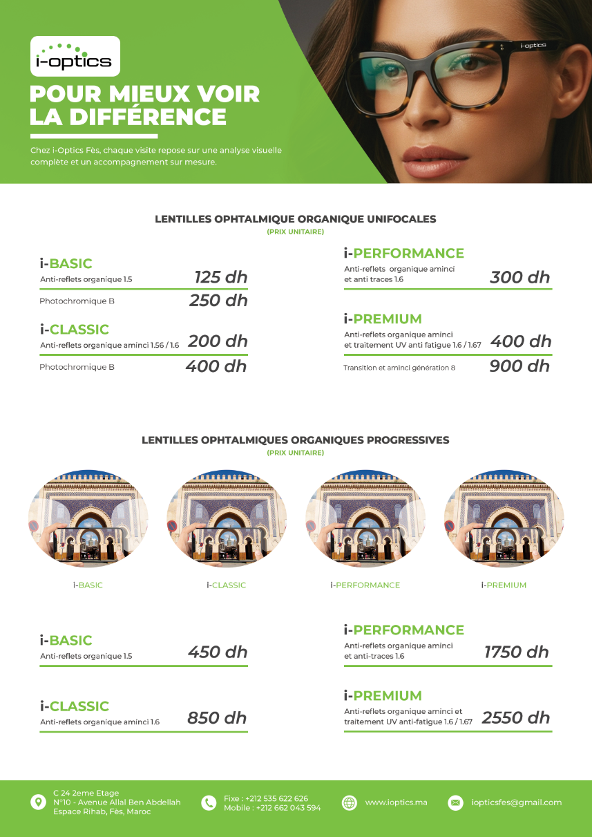 ILa gamme i-Performance signée I-Optics Fès s’adresse à ceux qui exigent une vision parfaite dans toutes les situations. Grâce à une technologie de conception avancée, ces verres sont entièrement personnalisés selon la correction, la posture et les habitudes visuelles du porteur.